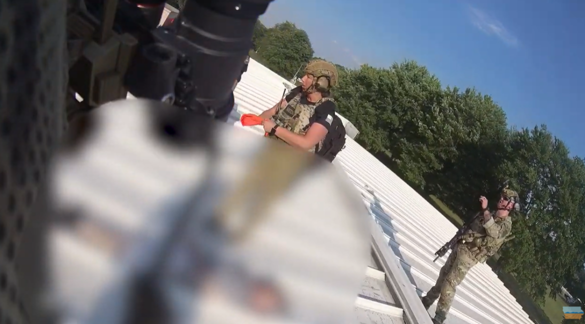 Someone can be heard on an officer’s radio asking, “Do we have access to a drone to clear this water tower?”