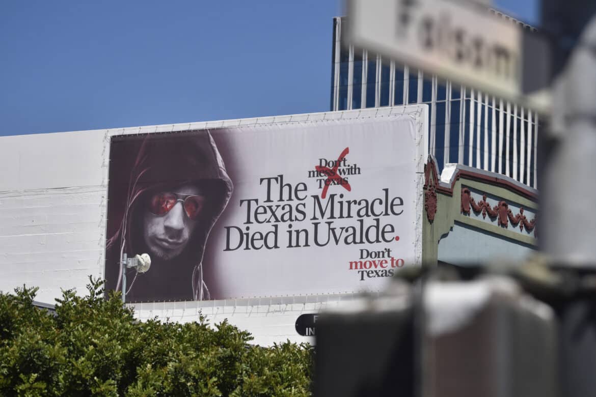 Mysterious billboards are appearing in San Francisco and Los Angeles, warning people not to move to Texas on the grounds of mass shootings. “The Texas miracle died in Uvalde”, “Don’t move to Texas,” the billboard reads alongside a picture of a hooded figure and the “Don’t mess with Texas” slogan crossed out.